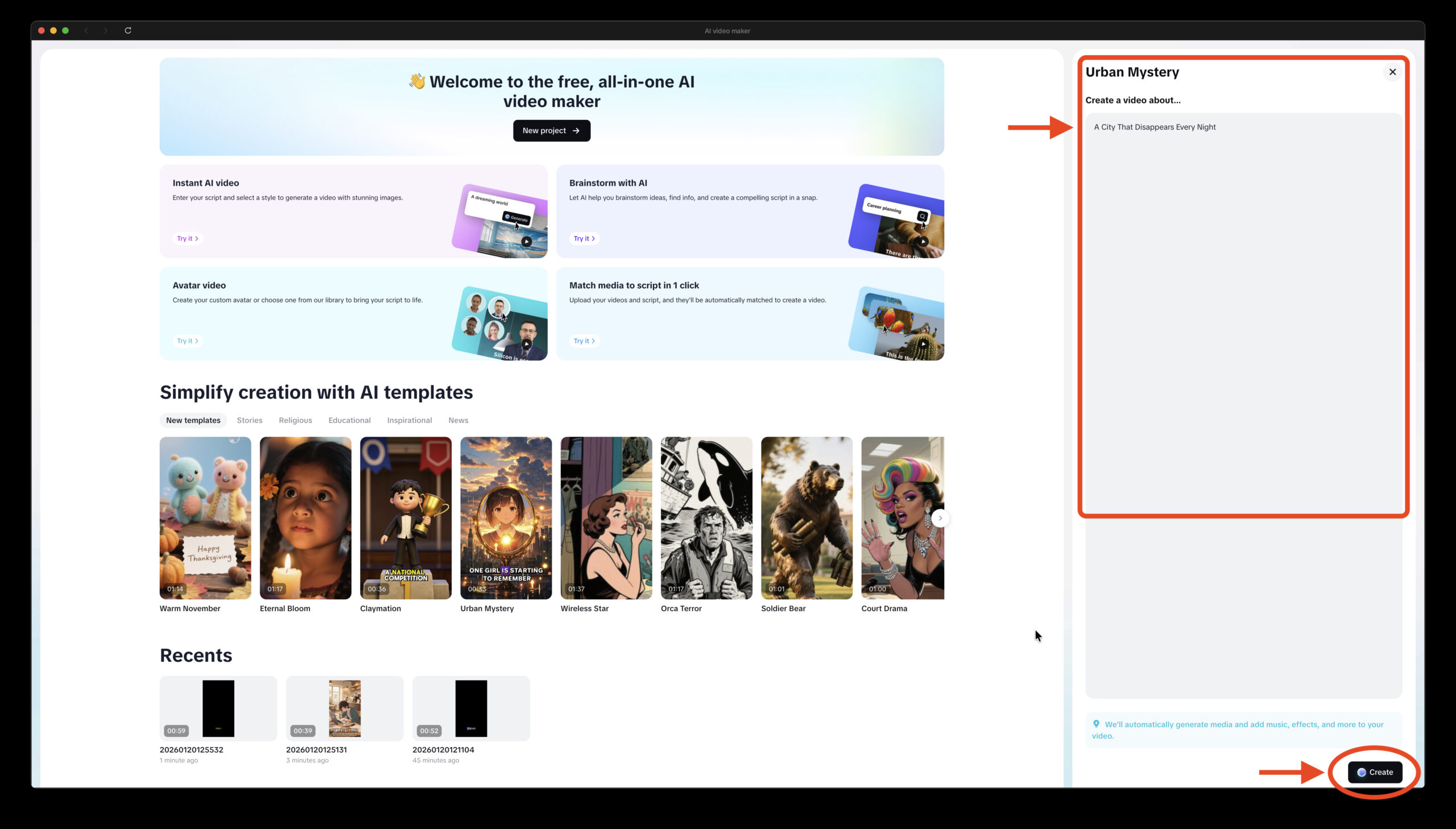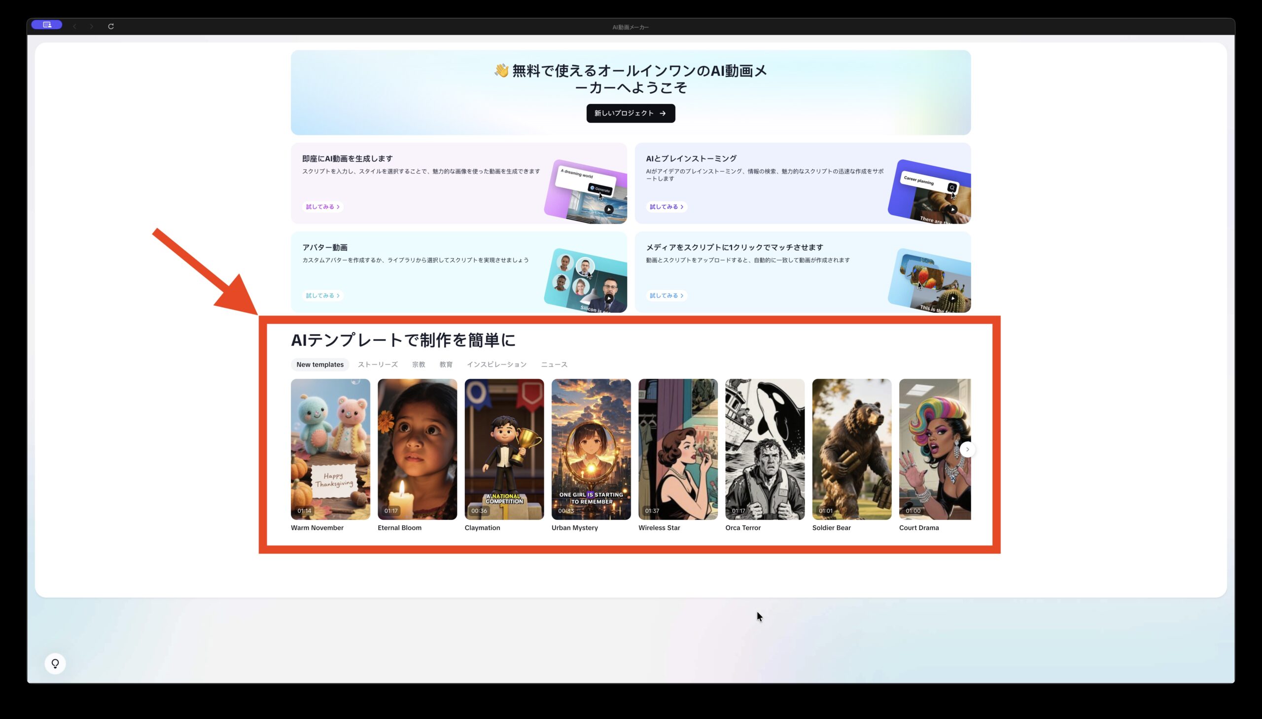 次にCapCutを開き、「AI動画メーカー」を選択します。 今回は、ちょっとオシャレでミステリアスな雰囲気にしようと思って、テンプレートの中から「Urban Mystery」をチョイス!✨